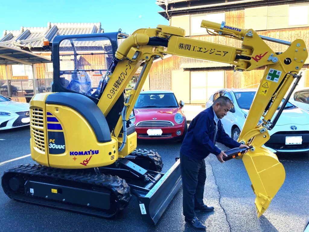 2024年12月19日大安吉日。KOMATSU社のバックホーが仲間入りしました。無事故を祈願してお神酒でお清めをし、記念撮影。4月入社の新入社員も新しいバックホーを前に気持ちが引き締まったようです。